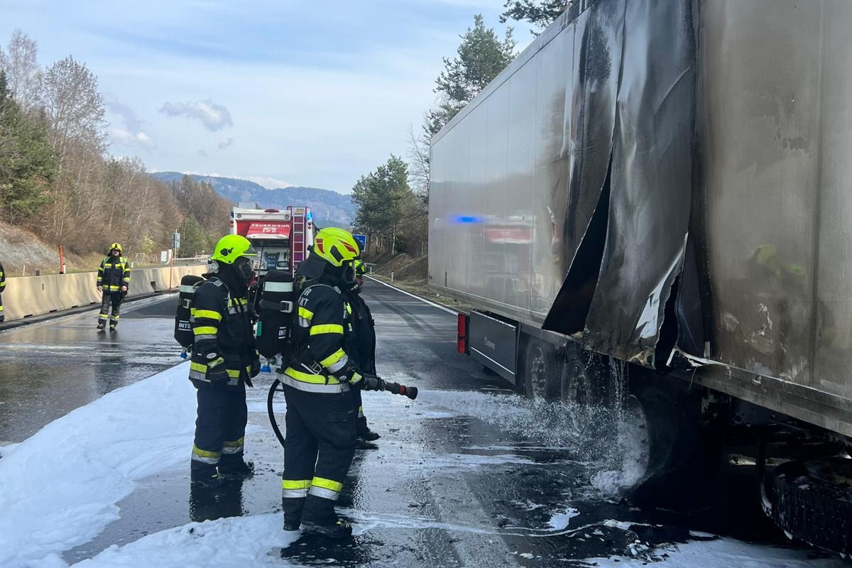 Am Donnerstag, 12. März 2026, geriet auf der A2 bei Völkermarkt der Anhänger eines Sattelschleppers während der Fahrt in Brand. Der 66-jährige Lenker konnte rechtzeitig anhalten.