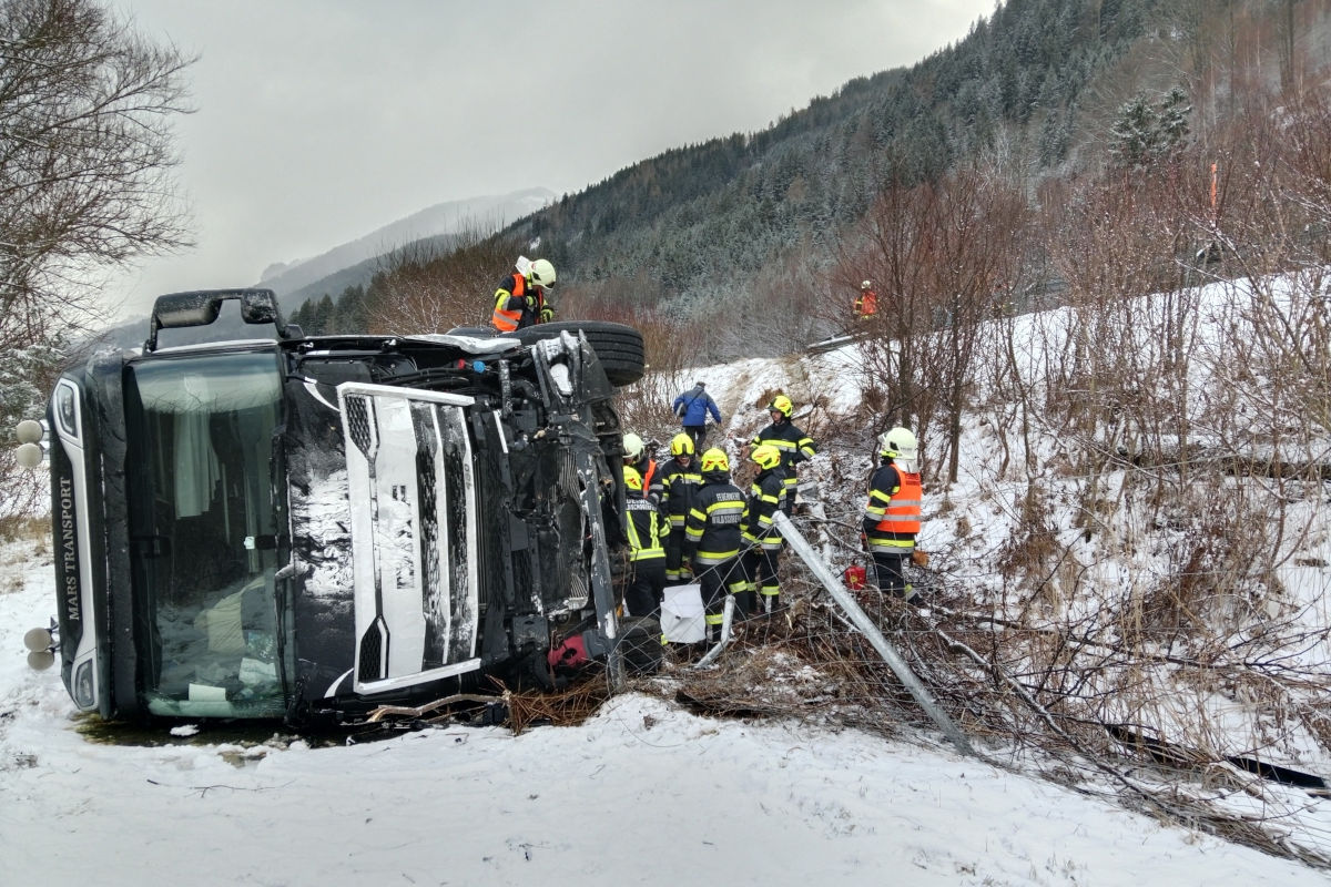 Der Lkw kam auf der Seite liegend zum Stillstand. (Bildquelle: FF Gaishorn am See)