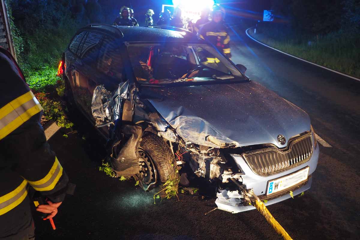 Kurz vor Mitternacht verlor aus unbekannter Ursache ein Lenker die Kontrolle über seinen PKW fuhr in den Straßengraben und stieß gegen eine Lärmschutzwand, deren Betonfundament völlig zerstört wurde.