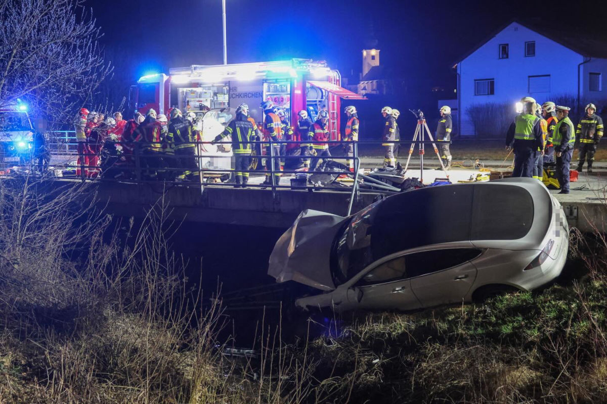 Am Sonntagabend, 8. März 2026, kam es in Buchkirchen zu einem Unfall zwischen zwei Autos. Ein Fahrzeug durchbrach ein Brückengeländer und landete im Bach. Vier Personen wurden verletzt, zwei davon schwer.