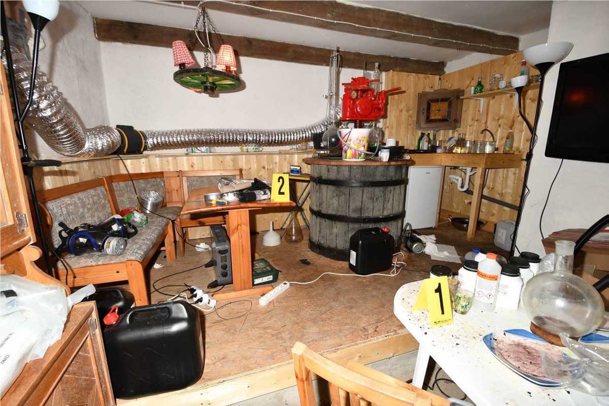 Die Polizei in Niederösterreich konnte im Bezirk Mistelbach in einem ursprünglichen Weinkeller ein illegales Drogenlabor sicherstellen, in dem synthetische Drogen im großen Stil hergestellt wurden.