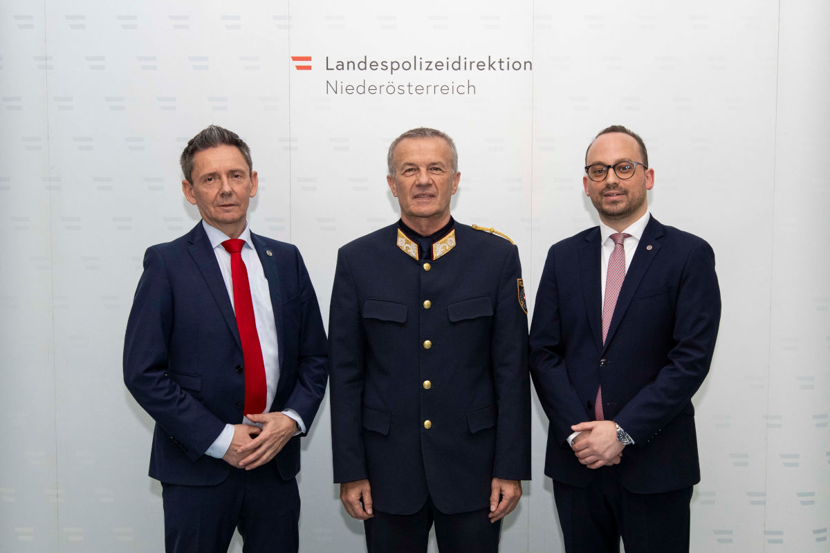 Briadier Stefan Pfandler, Landespolizeidirektor Franz Popp, Oberstleutnant Felix Gasterstädt des Bundeskriminalamtes (Bildquelle: LPD NÖ/LKA)