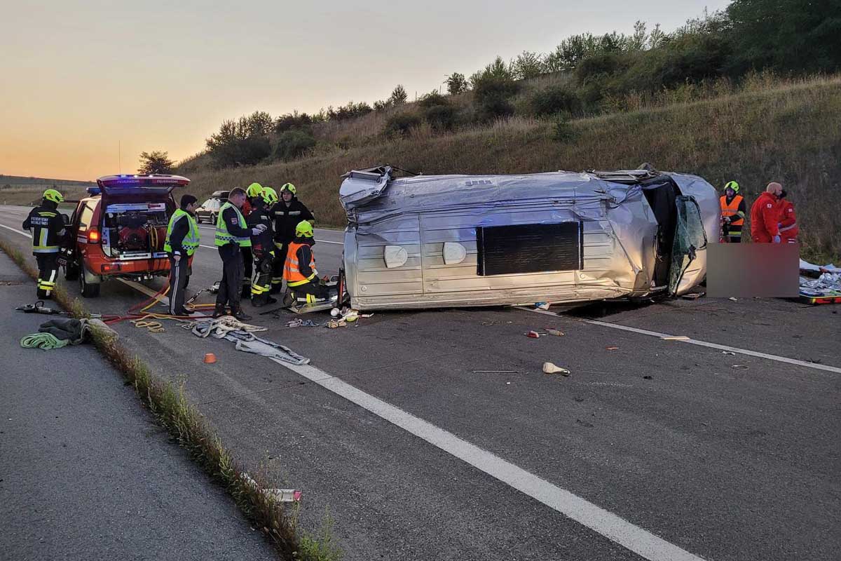 Ein Wohnmobil kam aus unbekannter Ursache von der Fahrbahn ab, prallte an der Böschung ab und kam schließlich nach mehreren Überschlägen auf der Seite liegend zum Stillstand (Bildquelle: Freiwillige Feuerwehr Hochleithen)