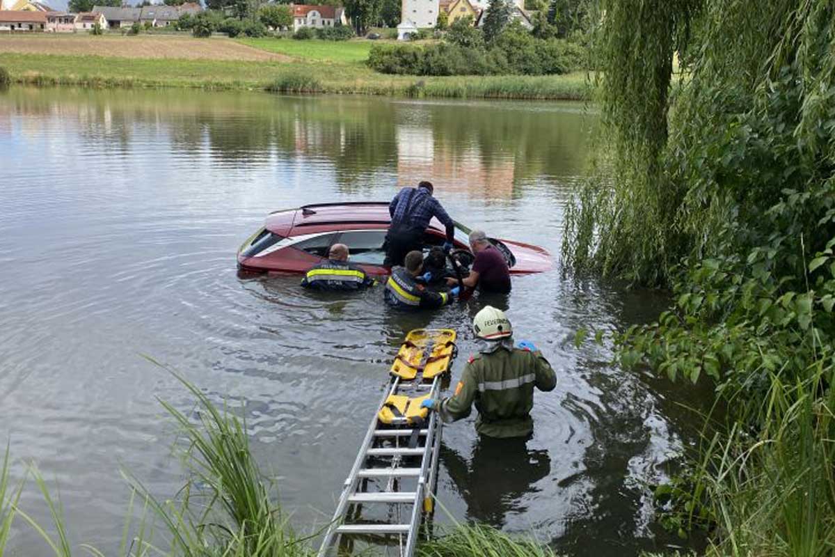 Am Samstag den 28. August um kurz nach elf Uhr wurden die Feuerwehren Geras und Hötzelsdorf mit der Information “Auto in Teich gefahren - Lage unklar” zum Gartenteich hinter dem Stift in Geras alarmiert.