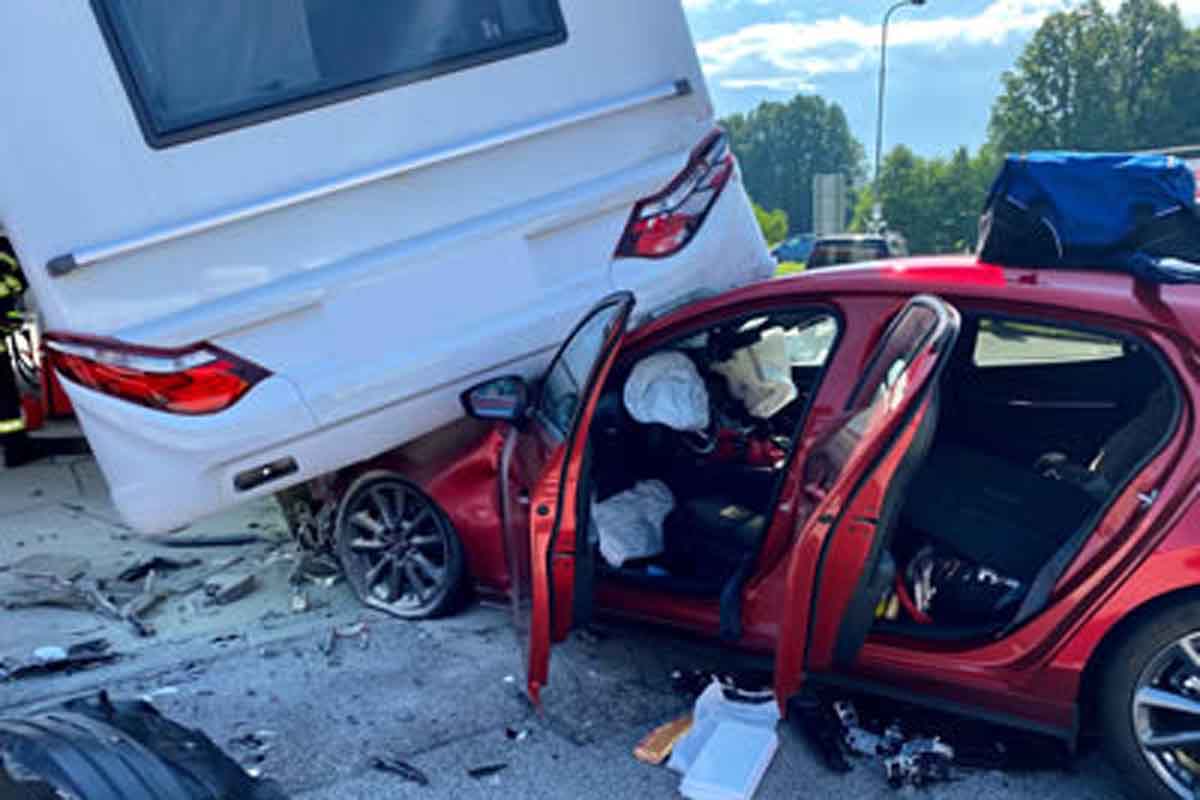 Ein Lenker war mit seinem PKW aus bislang unbekannter Ursache vom Kreisverkehr Gmünd-Mitte kommend gegen ein an der Zapfstelle abgestelltes Wohnwagengespann geprallt. Ein Mitarbeiter der Station hatte geistesgegenwärtig mit einem Pulverlöscher Schlimmeres verhindert.