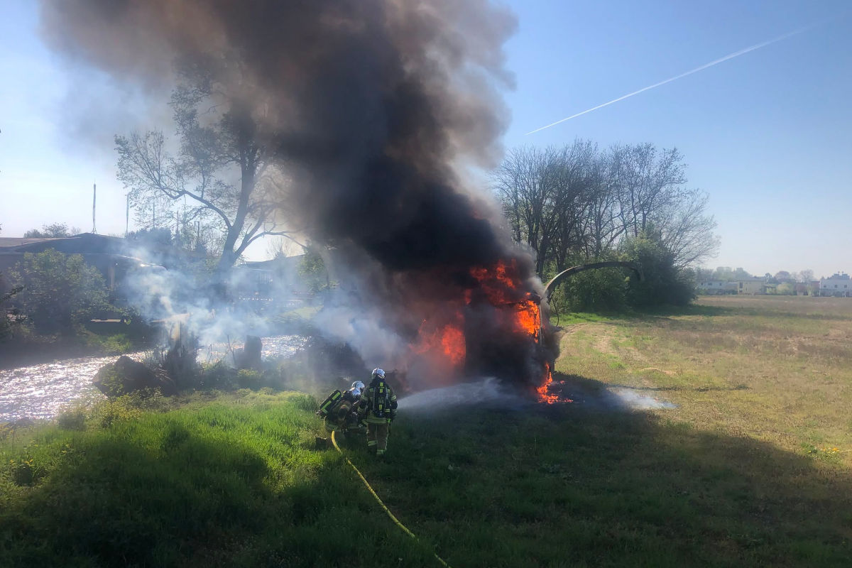 Der Holzhäcksler geriet während Arbeiten auf dem Acker in Brand. (Bildquelle: Berufsfeuerwehr Graz)