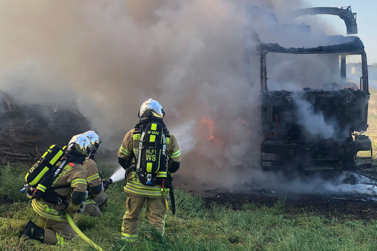 25 Einsatzkräfte der Berufsfeuerwehr Graz löschten den in Vollbrand geratenen Lkw in der Folge rasch. Dadurch konnte ein Übergreifen des Feuers auf einen nahen befindlichen Holzstapel verhindert werden.