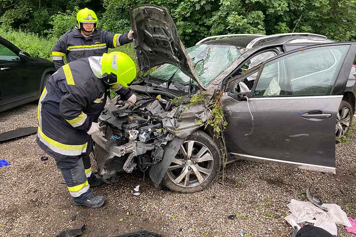 Durch den Anprall flog der Pkw durch die Luft, überschlug sich und kam auf einem Schotterplatz neben der B1 zum Stillstand (Bildquelle: Freiwillige Feuerwehr Gablitz)