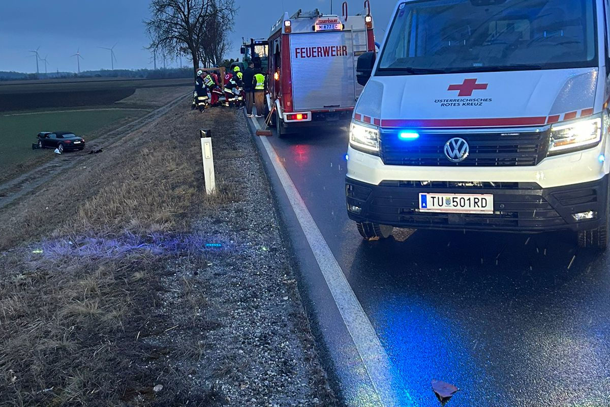 Ein beteiligter Pkw kam im Straßengraben zum Stillstand. (Bildquelle: FF Kettlasbrunn)