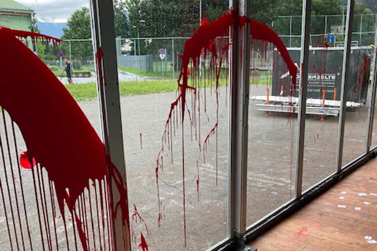 Die Täterschaft verschaffte sich Zutritt ins Zelt und verunstaltete anschließend das Mobiliar (Stühle, Holzbodenplatten, Druckergeräte, Fensterscheiben, Trennwände etc.) mit roter Farbe.