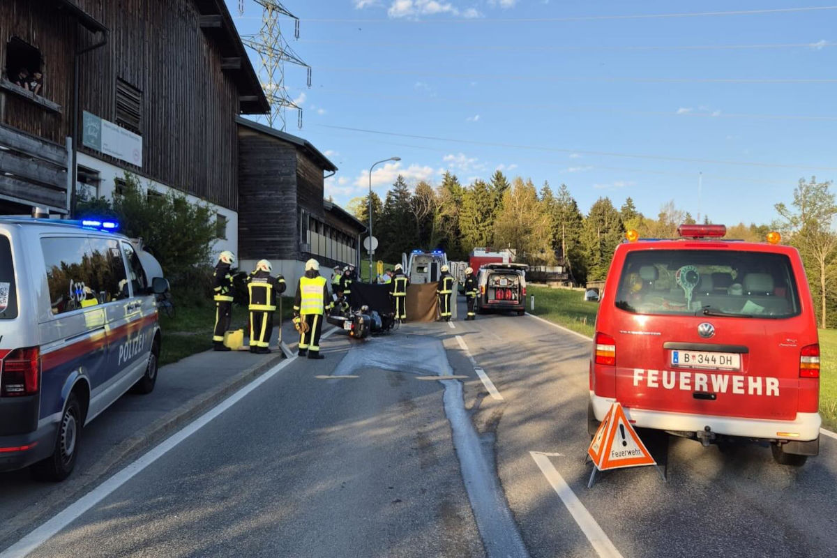 Am Freitagabend, 17. April 2026, kam es in Kennelbach zu einem Unfall. Ein Motorradfahrer kollidierte mit einem abbiegenden Traktor, stürzte und wurde verletzt. Das Motorrad geriet in Brand.