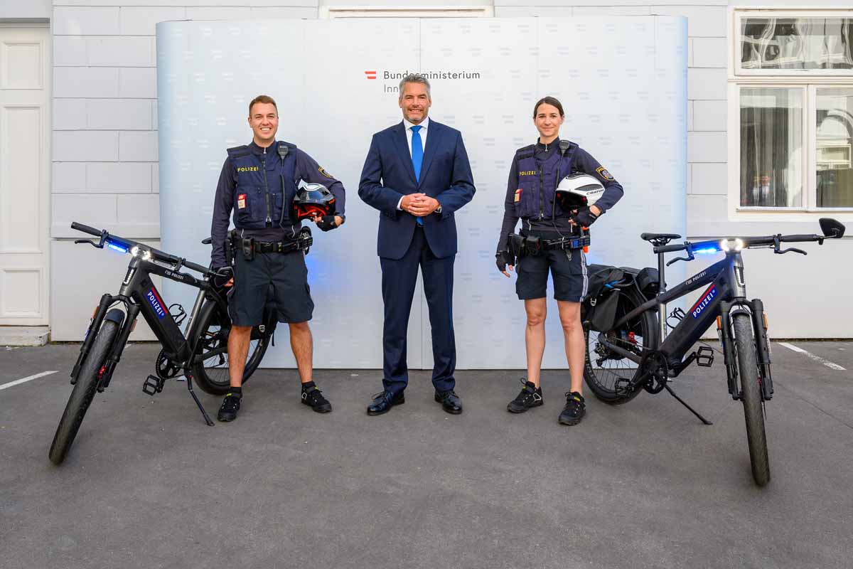 „Verkehrspolizei ist eine Grundaufgabe der Sicherheitsbehörden, deshalb ist es wichtig, hier mit modernen Einsatzmitteln am Ball zu bleiben“, sagte Innenminister Nehammer am Mittwoch bei der Übergabe zweier hochwertiger E-Bikes an die Wiener Landverkehrsabteilung. „Vor allem in Ballungsräumen, wo Räder und E-Scooter allgegenwärtig sind, ist auch die Weiterentwicklung des uniformierten Fahrraddienstes der Polizei wesentlich.“ Die neuen Fahrräder seien darüber hinaus ein weiterer wichtiger Schritt in der klimafreundlichen Modernisierung der Polizei, so der Innenminister.