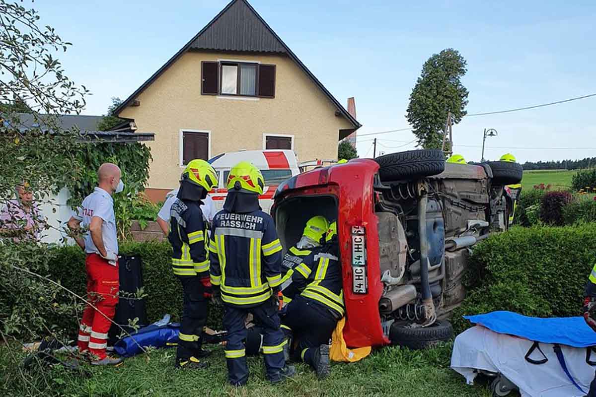Ein Fahrzeuglenker kam mit seinem Fahrzeug von der Fahrbahn ab und blieb auf der Fahrerseite liegen (Bildquelle: Landesfeuerwehrverband Steiermark)