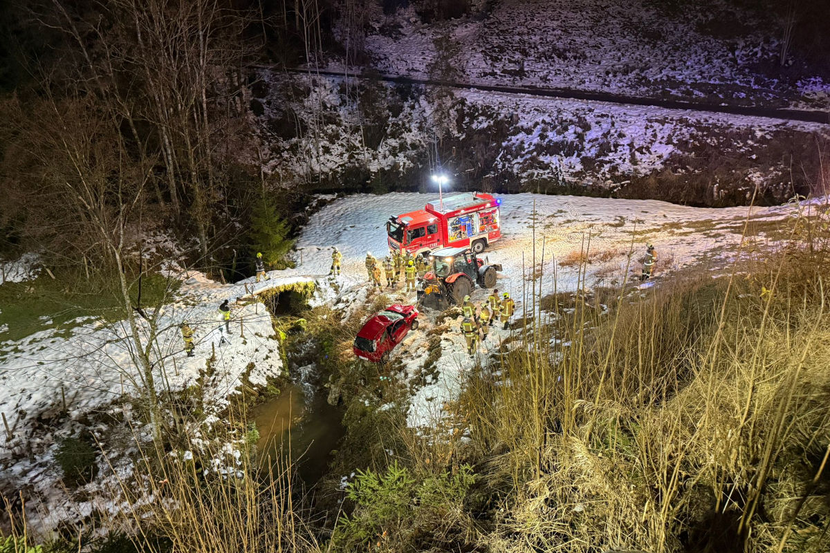 Am 07.12.2025, gegen 03.30 Uhr, meldet eine Anruferin einen Verkehrsunfall auf der Gemeindestraße Ritzgraben in Rettenschöss. Die Einsatzkräfte konnten an der Unfallstelle ein Fahrzeug im Graben eines Bachbettes vorfinden.