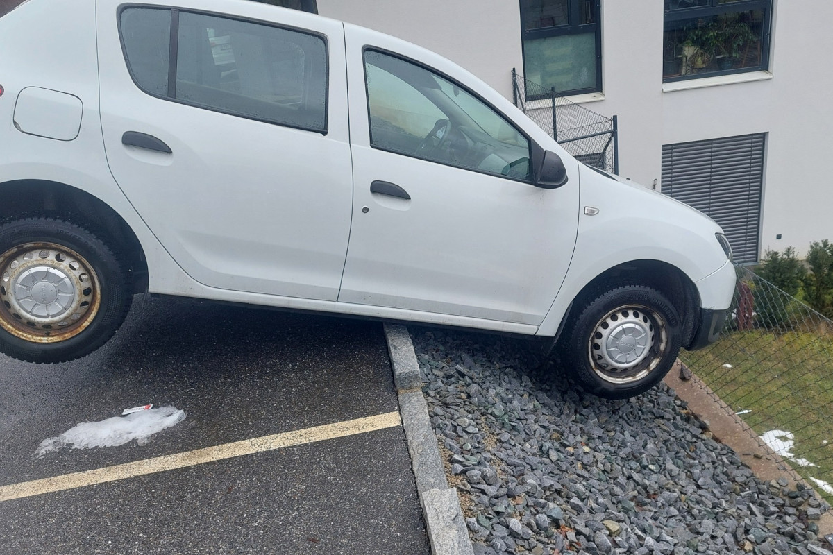 Auf einem Parkplatz drohte ein PKW über eine Böschung abzustürzen. Beim Eintreffen des Einsatzleiters zeigte sich, dass das Fahrzeug mit der Front bereits über die Bordsteinkante geraten war, während das Heck mehrere Zentimeter in der Luft hing. Jede Bewegung hätte ein Abrutschen des Fahrzeuges verursachen können.