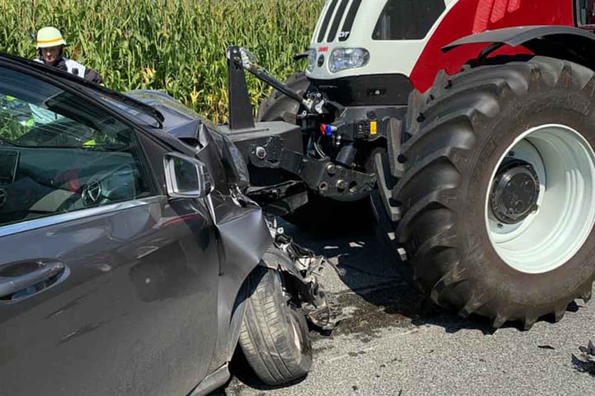 Am PKW entstand Totalschaden, der am Anhänger transportierte Stapler wurde schwer beschädigt, der Traktor wurde leicht beschädigt.