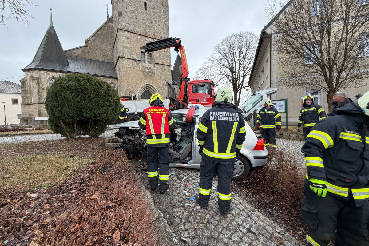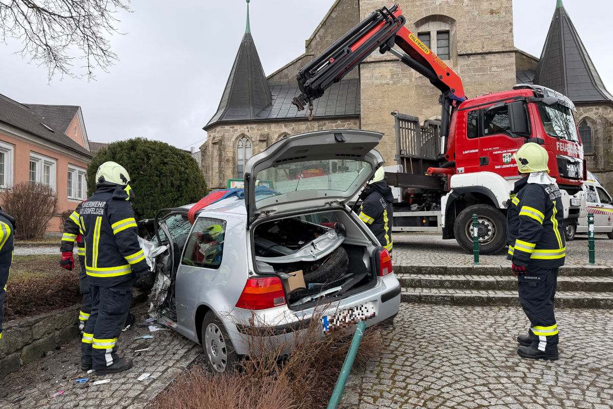 Am Donnerstag, 12. März 2026, kam es in Bad Leonfelden zu einem Unfall. Ein Pkw fuhr über eine Kreuzung auf einen Fußweg und prallte gegen einen Treppenaufgang. Die Lenkerin und ihr Beifahrer wurden verletzt.