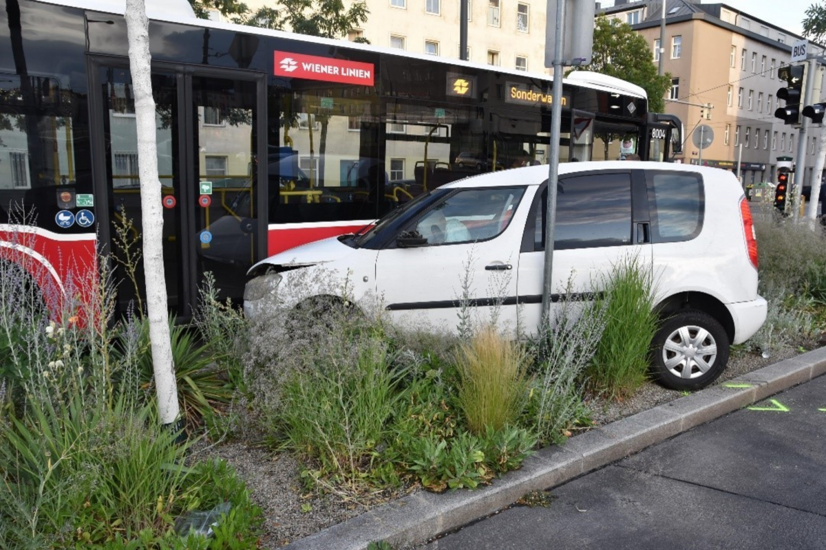 Der PKW überfuhr eine Verkehrsinsel sowie einen Grünstreifen, fuhr gegen ein Verkehrszeichen und kollidierte schließlich mit einem Linienbus, der am dortigen Busfahrstreifen hielt. Die 31-jährige Beifahrerin des Fahrzeuglenkers erlitt durch den Aufprall leichte Verletzungen und konnte nach medizinischer Erstversorgung durch einen Rettungsdienst in häusliche Pflege entlassen werden.