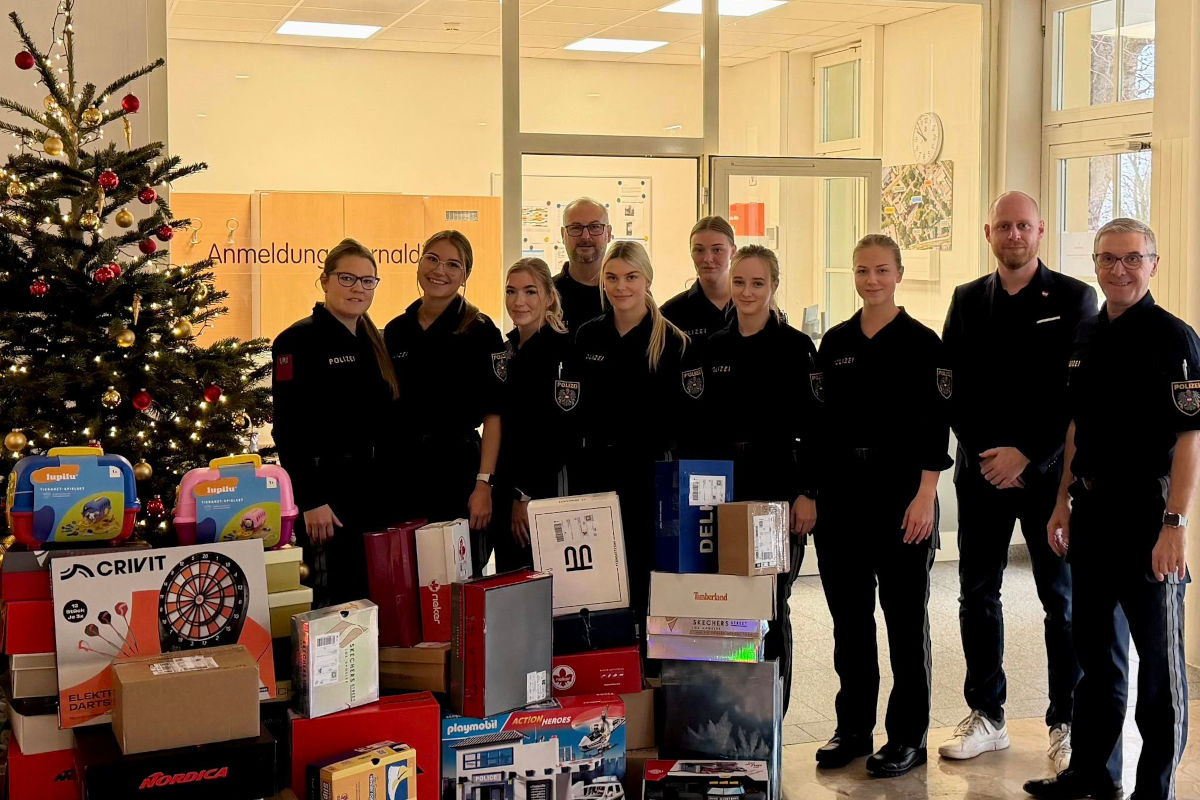 Polizeischülerinnen und -schüler des Bildungszentrums der Sicherheitsakademie Wels sammelten rund 100 Weihnachtsgeschenke, die an armutsbetroffene Kinder verteilt werden.
