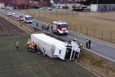 Am Montagnachmittag, 21. Februar 2022, kam ein 41-jähriger Lenker mit seinem Sattelschlepper auf der L 224, der Hatzendorfer Straße, auf das rechte Bankett. Das mit Motoren beladene Fahrzeug kippte um...