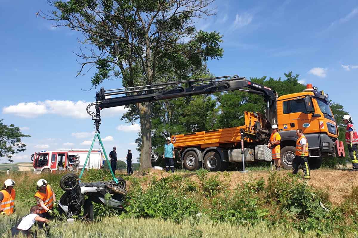 Die Person kam offensichtlich von der Fahrbahn ab und fuhr gegen einen Baum. Das Motorrad samt der verunglückten Person stürzte die Böschung hinunter und kamen in einem an der B6 angrenzendem Feld zum Stillstand.