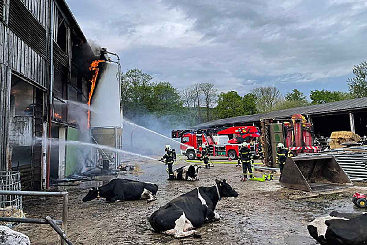 An der Einsatzstelle war die Feuerwehr anfangs mit einer großen Zahl freilaufender Kühe konfrontiert, die aus dem Stall flohen – die Tiere erschwerten den Feuerwehreinsatz, weil kein Platz für das Aufstellen der Drehleitern war.