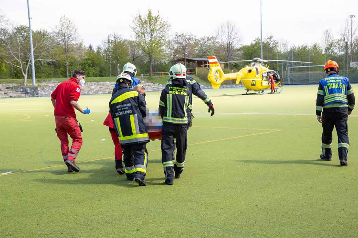 Der schwer verletzte Bauarbeiter wurde in weiterer Folge vom Rettungshubschrauber in eine Spezialklinik geflogen (Bildquelle: Freiwillige Feuerwehr Mödling)