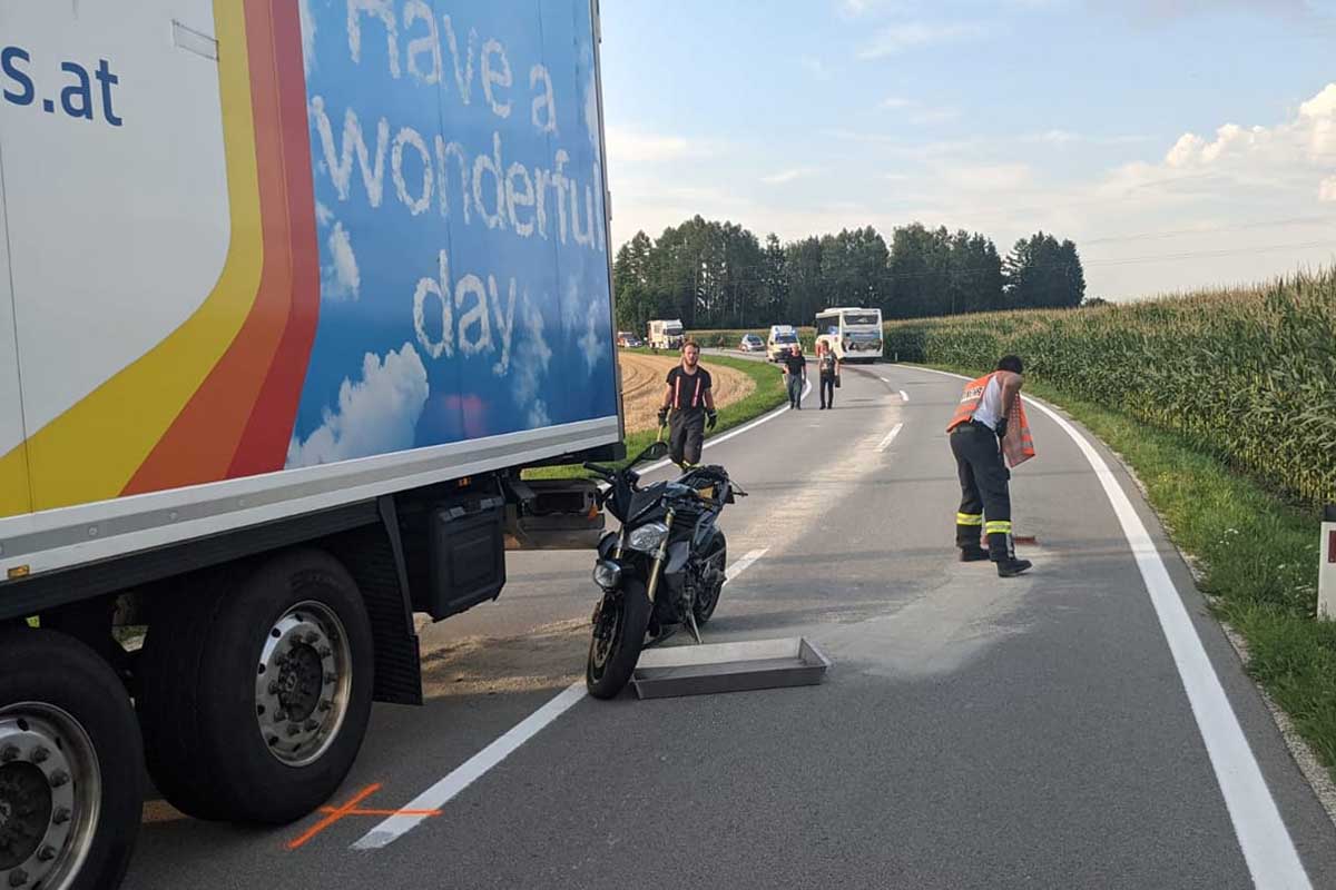 Rüstorf - Lastwagen schleift Motorrad 150 Meter weit mit!