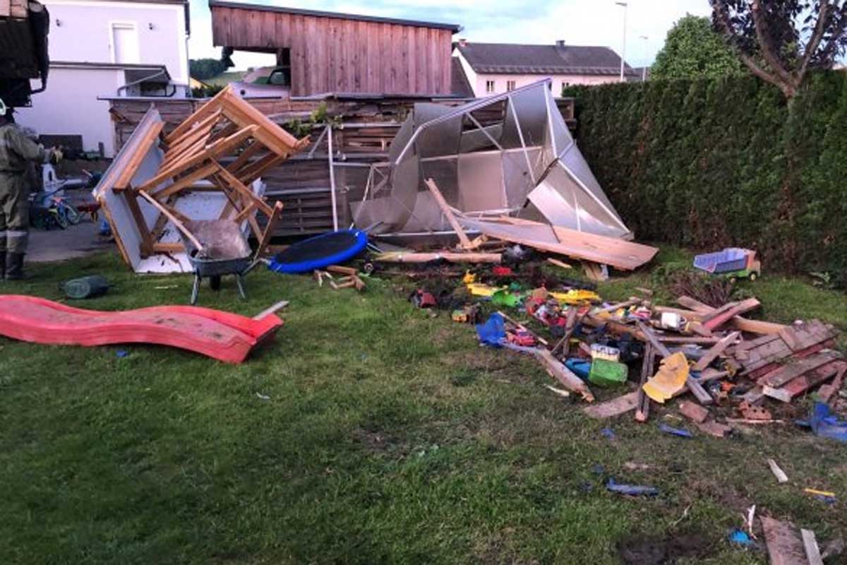 Es wurden mehrere Thujen, ein Sandspielkasten, ein Kinderspielturm mit Rutsche, sowie ein Gartenhäuschen beschädigt.