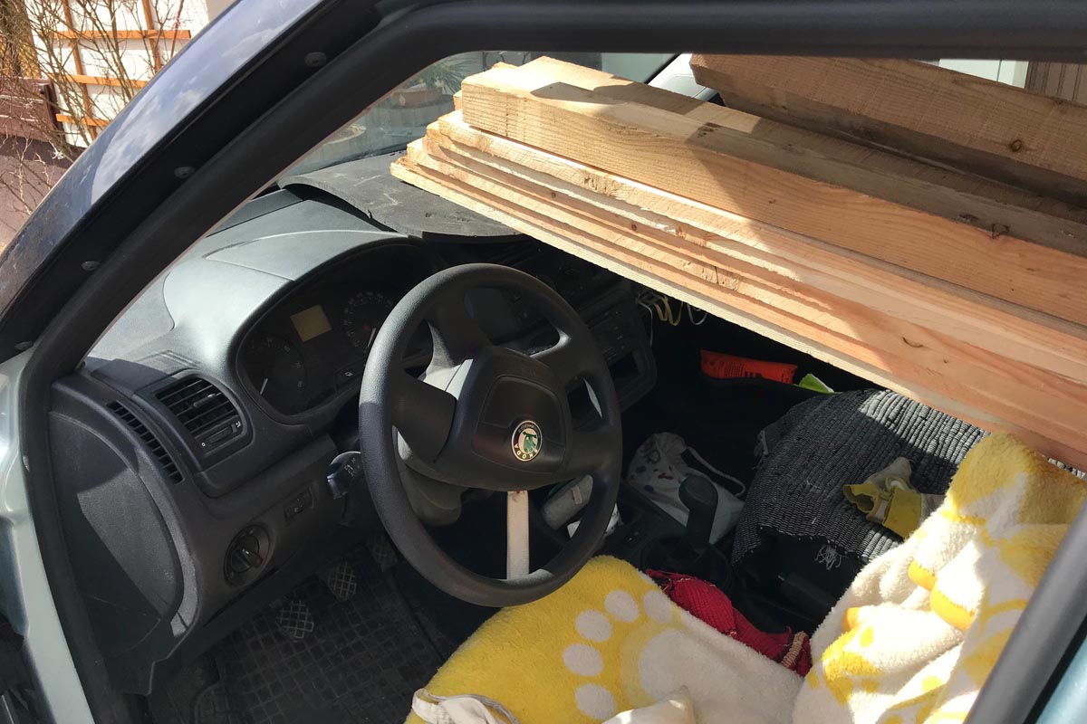 Im PKW waren etwa vier Meter lange Holzpfosten durch den Fahrzeuginnenraum am Armaturenbrett abgelegt worden.