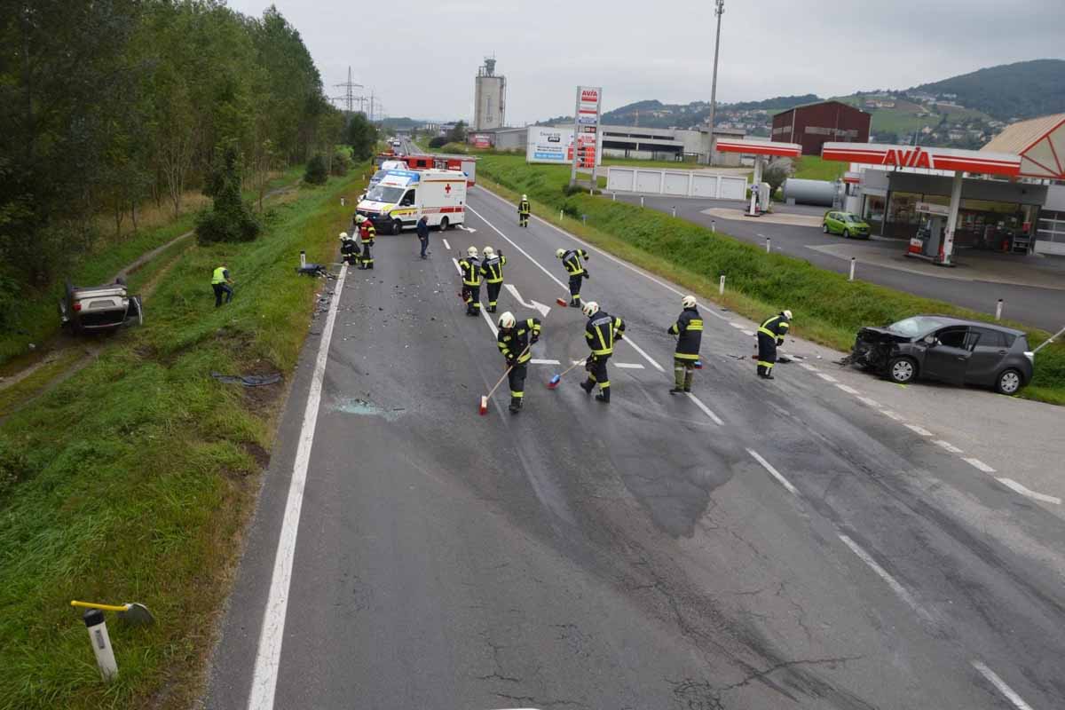 Die Freiwilligen Feuerwehren Steyregg und Lachstatt führten die Aufräumarbeiten und Ölbindung durch und unterstützten den Abschleppunternehmer bei der Fahrzeugbergung.