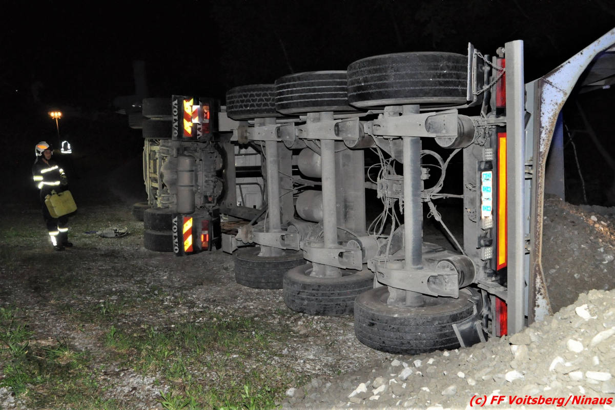 Gegen 03:10 Uhr lenkte ein 44-Jähriger sein Sattelzugfahrzeug mit dem mit Schotter beladenen Anhänger. Bei Entladungstätigkeiten in einer Hauseinfahrt dürften der Lkw und der Anhänger seitlich umgekippt sein. Der 44-Jährige erlitt dabei Verletzungen unbestimmten Grades und wurde vom Roten Kreuz ins UKH Graz gebracht.Kräfte der Freiwilligen Feuerwehr Voitsberg leitete die Bergearbeiten des umgestürzten Lkws.